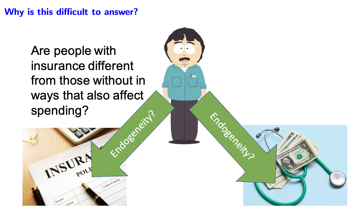 Problem is that we could not just compare the health spending across those with and without insurance. The groups are fundamentally different. That is, the less healthy people more likely