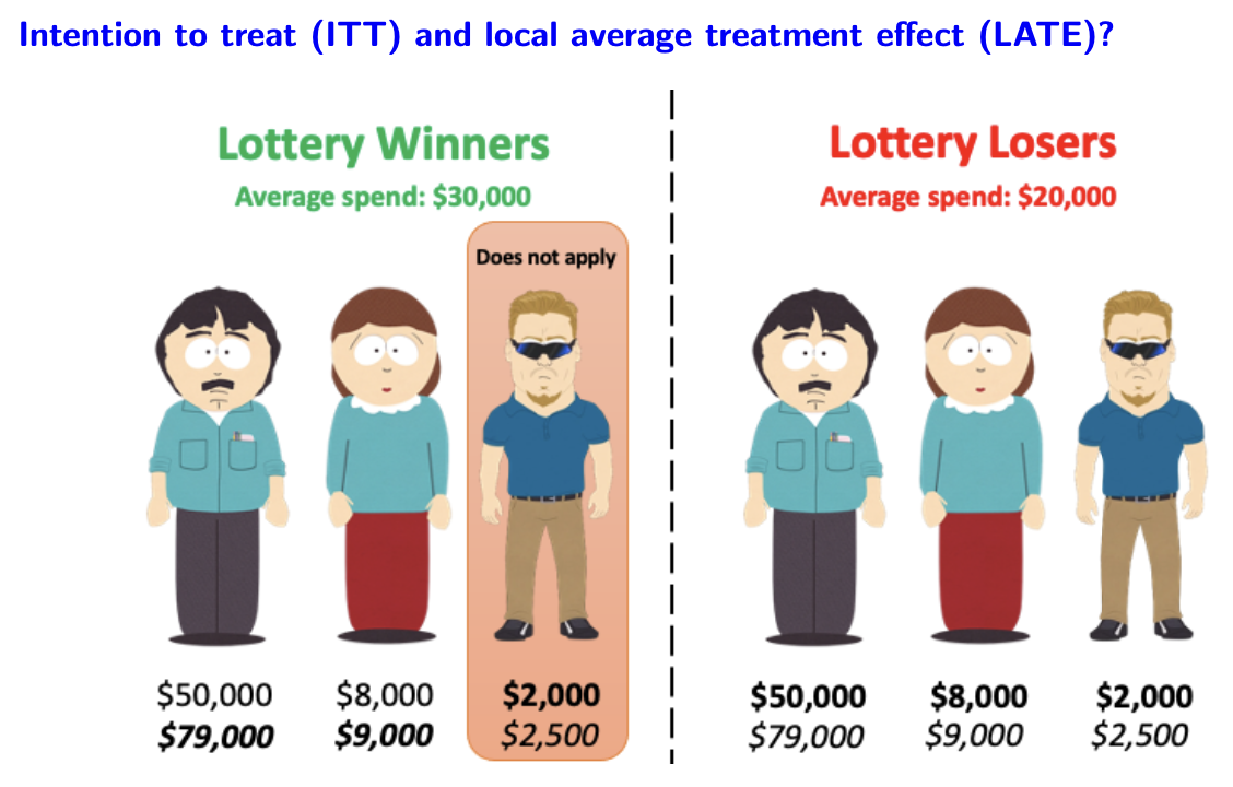 In this example, the ITT effect is $10,000: difference in average spending between those who won the lottery and those who did not.