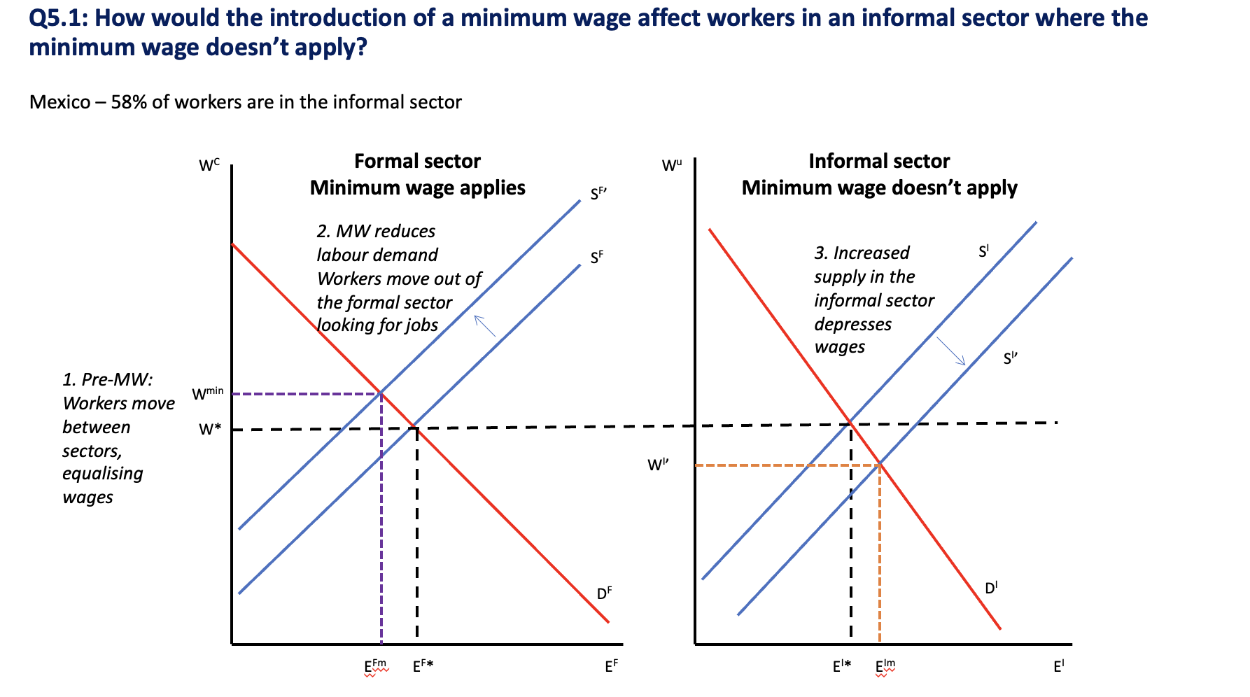 Question 5.1: How would the introduction of a minimum wage affect the employment and wages of skilled (= high wage) workers? What about workers in an informal sector where the minimum wage doesn’t apply?