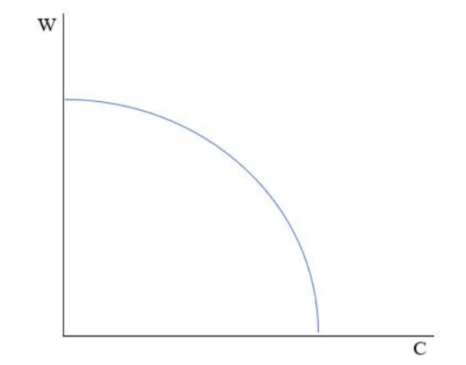 However, in the reality, the PPF curve might not be linear, the cost switch to another industry might be costly. The PPF below is bowed out so the MRS is increasing, to produce more , you have to give up much more , ( is wine and is chips)